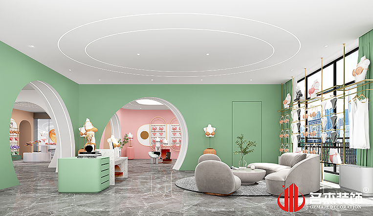 這次是一家專業從事女性功能型內衣研發、生產及特許加盟形式生產、銷售企業。設計團隊以該行業特點作為設計重點,采用非常規的設計路線,大膽的使用線條和弧形元素來增加空間的層次感,同時對于不同的子品牌采用不同的色彩來進行過渡,融入整體空間的同時,還能增加大眾對于品牌的認知度。